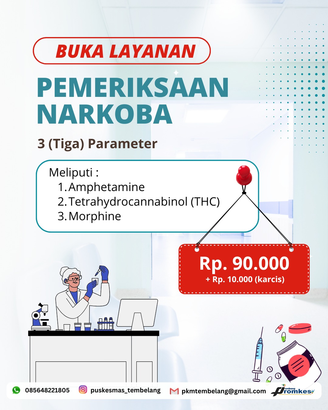 Pelayanan pemeriksaan narkoba ini untuk mengetahui adanya zat narkoba di dalam tubuh seseorang. Ada 3(tiga) parameter yang di gunakan yaitu pemeriksaan a) Ampethamin b) Tetrahidrocannabinol c) Morphin. Bagi masyarakat yang mengingkan test bebas narkoba bisa langsung datang ke Puskesmas tembelang melalui loket pendaftaran. Biaya test bebas narkoba sesua dengan perda Rp 90.000. ditambah admin Rp 10.000,-(phs).